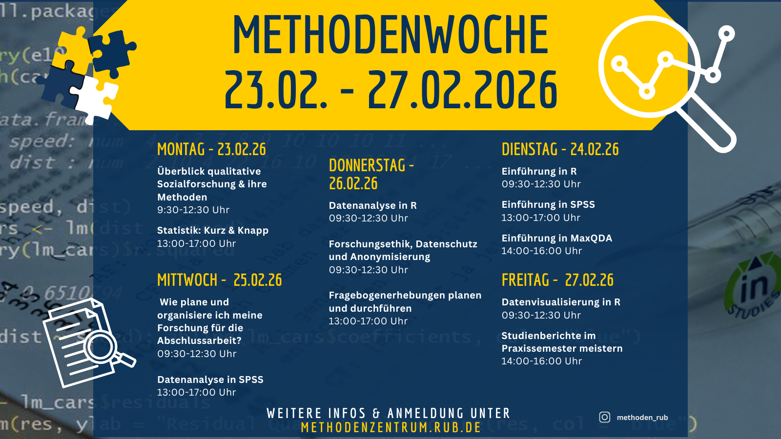 Das Methodenzentrum bietet Workshops zu unterschiedlichen Themenfeldern an: Von Software-Workshops bis hin zu spezifischen Methoden-Workshops, von der Datenerhebung bis hin zu Auswertungsverfahren.